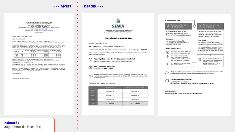 Melhorar a comunicação com o contribuinte cearense, por meio da aplicação de Linguagem Simples, Direito Visual e Design Editorial: este é o objetivo do projeto Redesign de Intimações do Contencioso Administrativo Tributário (Conat). A iniciativa é fruto da cooperação entre o Íris e a Secretaria da Fazenda do Ceará (Sefaz-CE). Na quinta-feira (19), o projeto foi apresentado em evento para profissionais do Conat e da Secretaria Executiva da Receita.